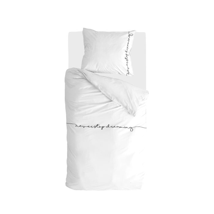 Een quote waar we ons allemaal aan zouden moeten houden staat op dit overtrek: ‘never stop dreaming’. Het helder witte overtrek zorgt ervoor dat je het liefst de hele dag wilt blijven dromen. De sierlijke letters geven een speels tintje aan het geheel. Kwaliteit: 100% katoen (renforcé) – soft touch